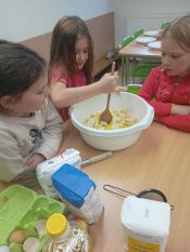 Nejmladší žáci společně upekli voňavou jablečnou buchtu, která byla sladkou tečkou za celým dnem.